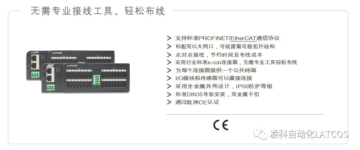 MR系列面板式分布式I/O支持標準PROFINET/EtherCAT通信協議,可以作為西門子S7-1200/1500,倍福、歐姆龍、CODESYS等PLC主站的從站單元來使用,通過標準的以太網通訊,我們很容易將I/O模塊分布到信號區域的附近就近接線;同時由于使用了行業標準的e-con連接器,我們為每個輸入輸出點都提供了獨立的公共終端,使得用戶可以將傳感器、繼電器、接觸器、電磁閥、光電開關、限位開關等現場觸點直接與I/O模塊相連接,極大的節省了時間及布線成本。