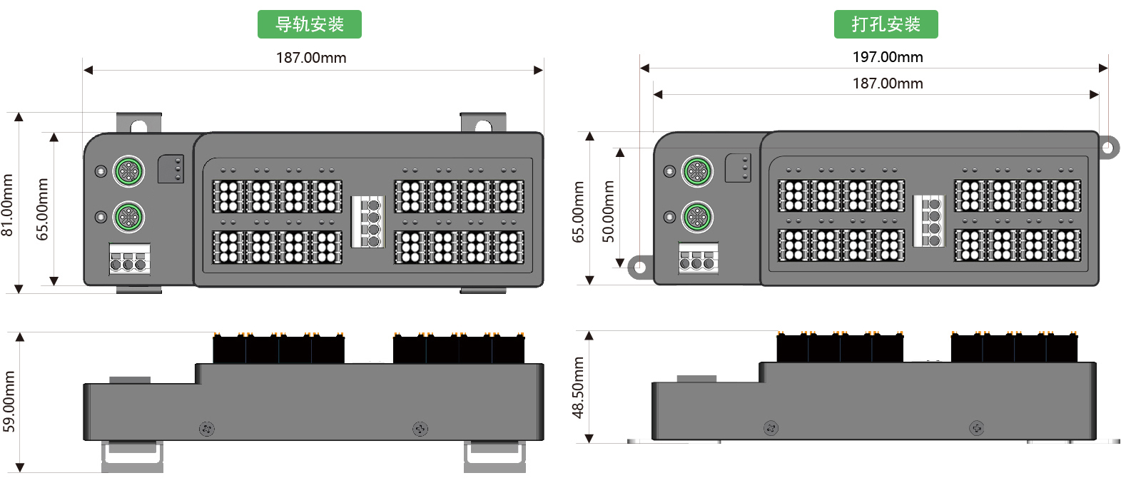 面板式快接線分布式I/O,EtherCAT通訊,2xM12,可級聯;數字量32入 NPN,24VDC,歐式彈簧端子;導軌安裝&打孔安裝(下單時需備注)
