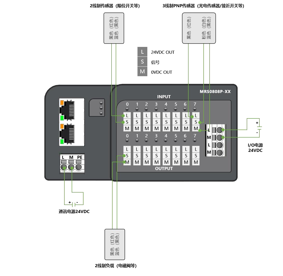 面板式快接線分布式I/O,CC-Link IE FiledBasic通訊,2xRJ45,可級聯;數字量8入8出 PNP,24VDC,0.5A,歐式彈簧端子;導軌安裝&打孔安裝(下單時需備注)