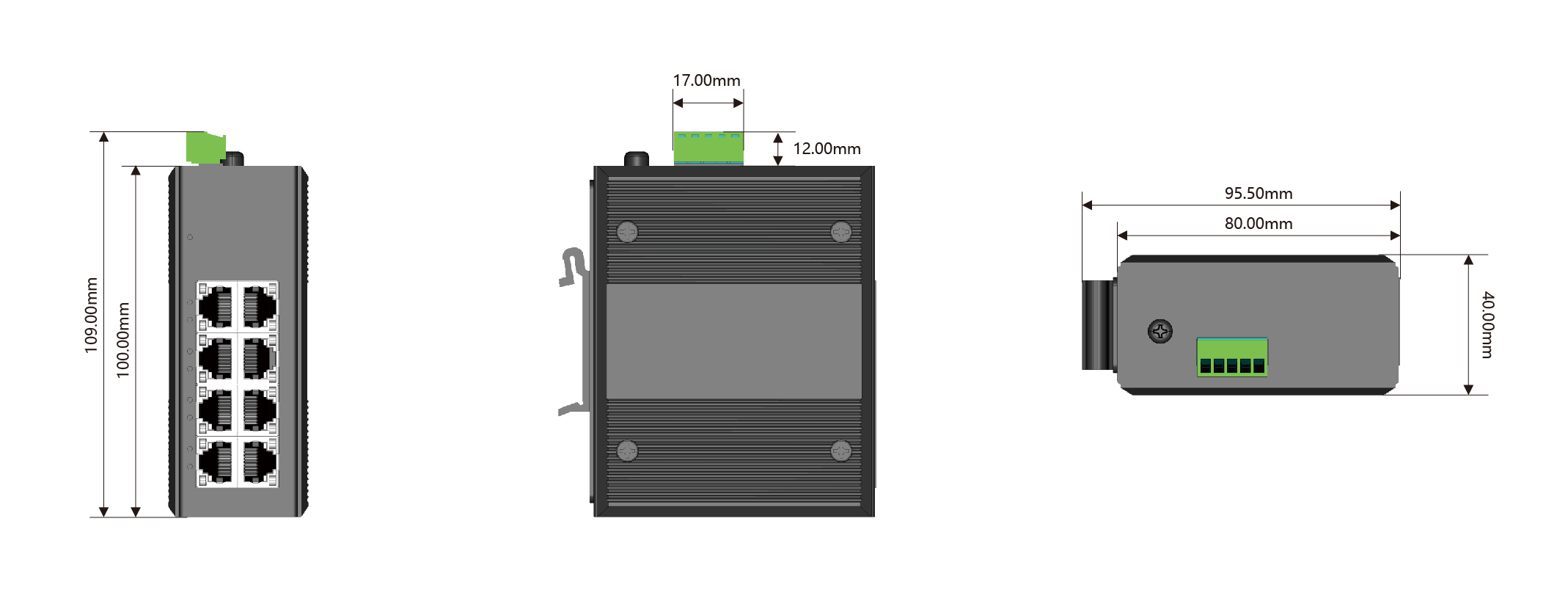 非管理型工業交換機,迷你型,5電口,千兆,12V~52VDC,IP50,金屬外殼,DIN35導軌安裝
